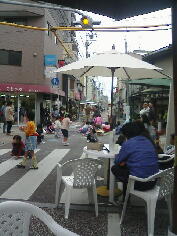 歩行者天国開始(美野島通り) 橋通り 押しチャリ看板 自転車や乳母車とカフェセット ベンチの三人娘